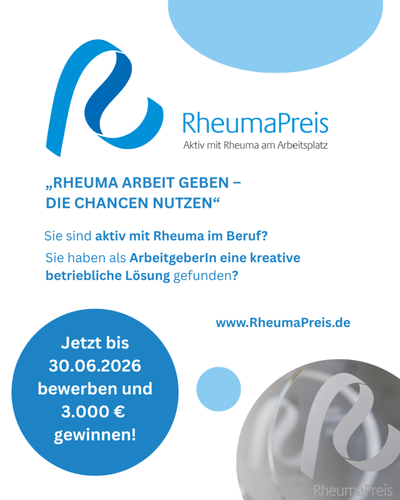 Ermutigen Sie Ihre Patientinnen und Patienten, sich bis zum 30. Juni 2026 für den „RheumaPreis“ zu bewerben – die Teilnahme ist ganz einfach. Erforderlich ist lediglich die Darstellung kreativer Lösungen für angepasste und unterstützende Maßnahmen am Arbeitsplatz, die gemeinsam mit dem Arbeitgeber entwickelt und erfolgreich umgesetzt wurden.